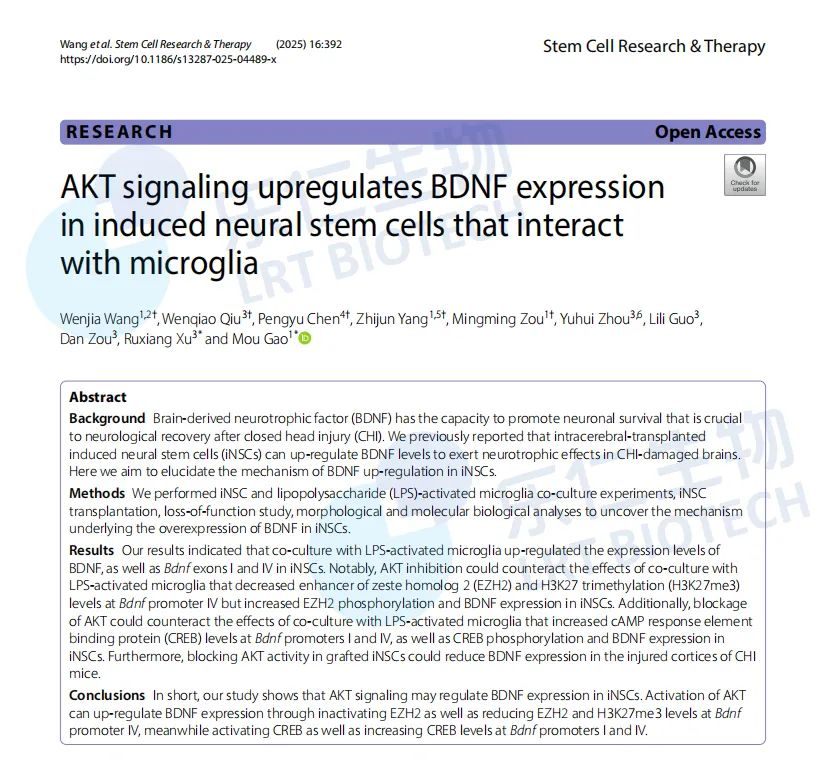 2025年7月21日,河北樂仁生物楊志軍博士與解放軍總醫院高謀博士合作,并以共同第一作者在國際權威期刊Stem Cell Research & Therapy在線發表了題為“AKT signaling upregulates BDNF expression in induced neural stem cells that interact with microglia” 的開拓性研究成果。